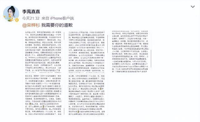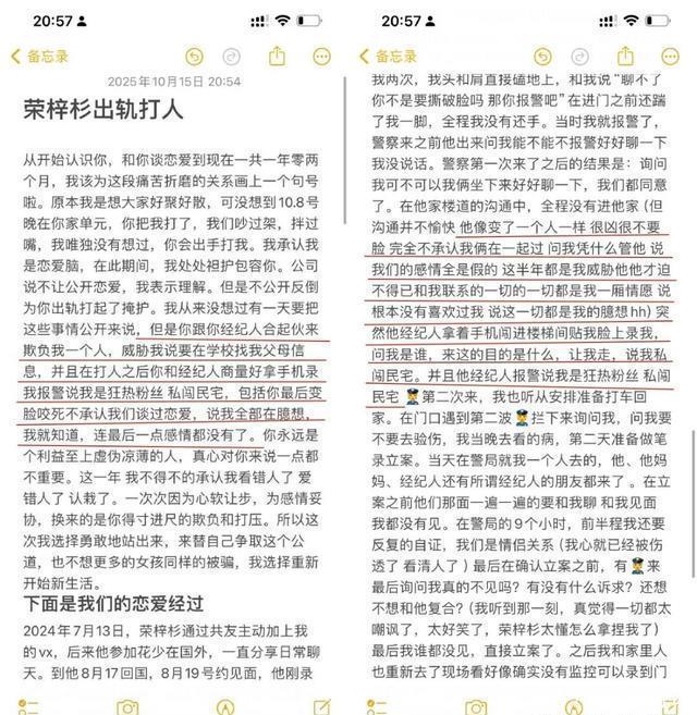 先是15日晚上,演员李禹熹突然在社交平台上发布长文,要求荣梓杉道歉。 她的文章很长,主要控诉点是:1.两人的故事始于 2024年,是 荣梓杉在参加《花儿与少年》前先主动追求的她,但恋爱三个月后她却被荣梓杉开始冷暴力;2.在恋爱期间,荣梓杉多次劈腿,与多名女生暧昧;3.荣梓杉对她施暴,两人产生肢体冲突;4.她因为荣梓杉冷暴力一度确诊中度焦虑和抑郁。