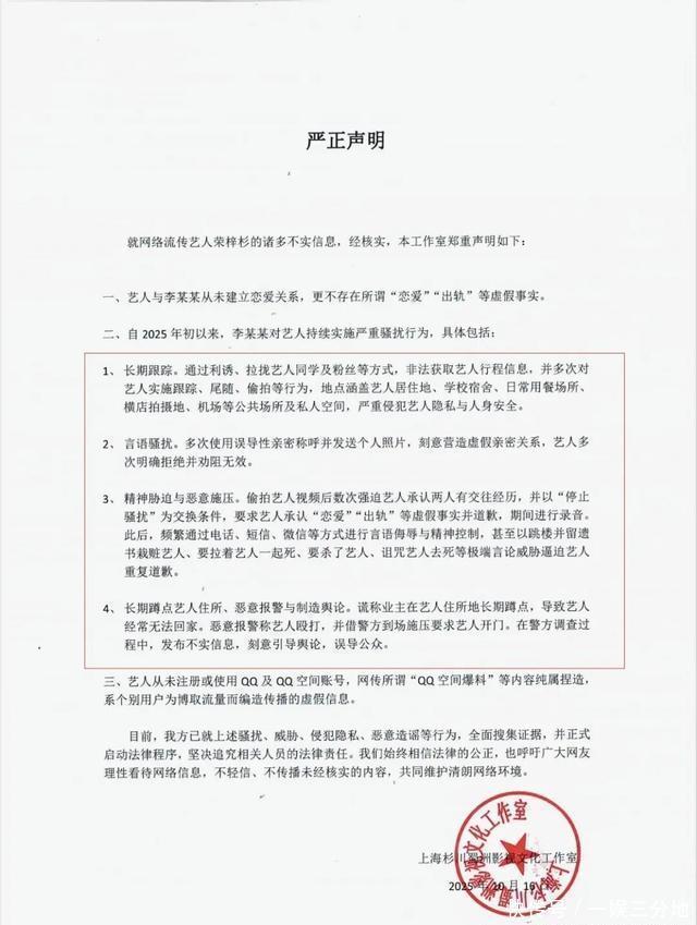 在声明里,特意强调了李禹熹通过长期跟踪、言语骚扰、精神胁迫与恶意施压、长期蹲点艺人住所等方式制造了虚假的与荣梓杉交往的信息,而荣梓杉多次拒绝,她爱而不得才发布不实信息刻意借舆论误导公众。